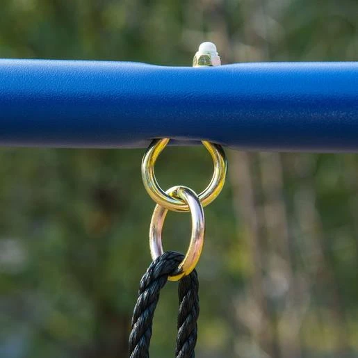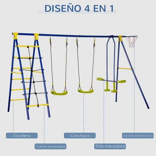 – Set de columpio infantil compuesto por 2 columpios, un balancín para 2, una escalera doble (un lado de cuerdas y otro de barras) y una canasta de baloncesto
