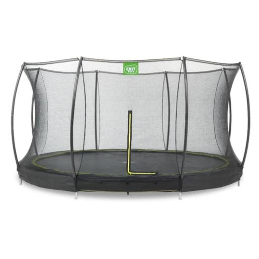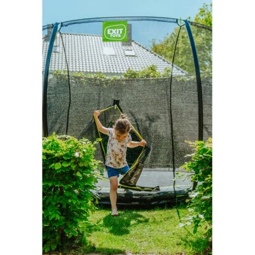 El trampolín Exit Silhouette en el suelo con red de seguridad es un trampolín redondo de buena calidad.
