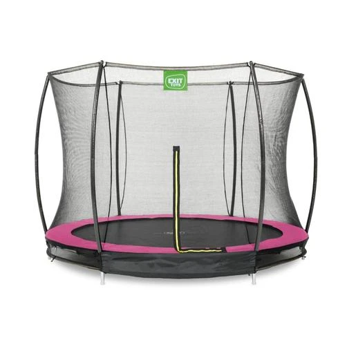 El trampolín Exit Silhouette de color rosa en el suelo con red de seguridad es un trampolín redondo de buena calidad.