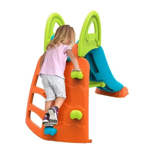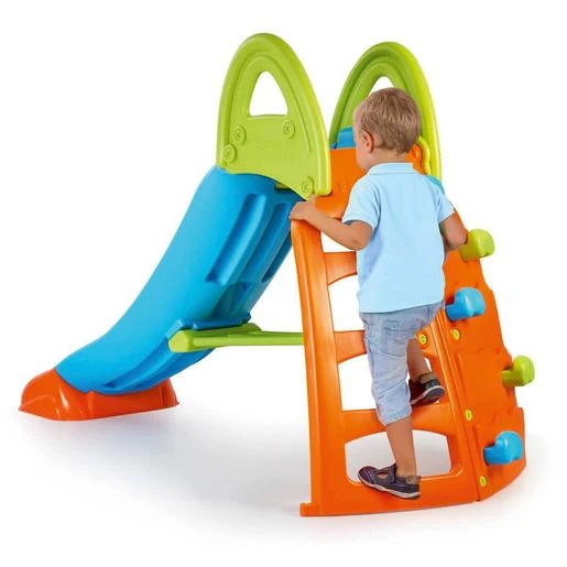 Un original tobogán con dos maneras de subir: unas escaleras clásicas anti-deslizantes y un pequeño rocódromo, con unas presas de escalada para ascender a lo alto del tobogán.