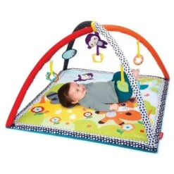 Este gimnasio-colchoneta con texturas y actividades tiene 5 juguetes separables para estimular al bebé: Un monito mordedor, rosquilla sonajero, espejo, hoja mordedor y anillas.