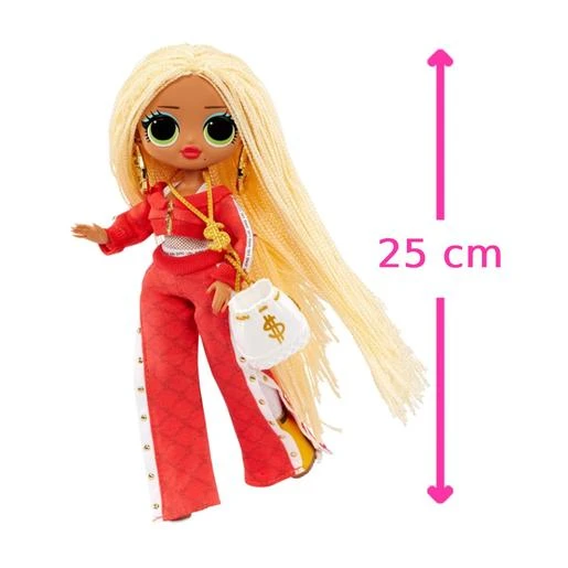 La caja incluye una muñeca de moda LOL Surprise OMG de la Serie 1, un traje fabuloso, zapatos deslumbrantes, accesorios fantásticos, cepillo para el pelo y soporte para muñeca.