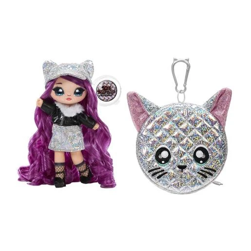 ¡Muñeca de moda suave más un monedero de tela metálica con pompones de animales coleccionables!