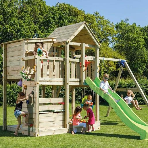 El parque infantil Palazzo incluye las maderas, la rampa de tobogán de color verde, los anclajes para fijarlos en un suelo blando de tierra o césped, los tapones de perno, las manijas y las instrucciones de montaje.
