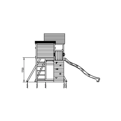 Las medidas de la cabaña son: 143 cm (largo) x 124 cm (ancho) x 100 cm (altura más baja). La altura de la plataforma del tobogán es de 1,50 m. La altura de la plataforma de la casita es de 1,70 m. La rampa del tobogán es de 3 m de largo. Debe dejar 2 metros alrededor de zona de seguridad.