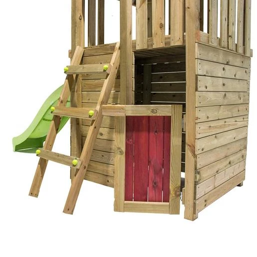 El parque infantil Tibidabo incluye todas las maderas para montar el parque, la casita y la escalera, la tornillería, la rampa de tobogán de color verde y los anclajes para fijarlos en un suelo blando de tierra o césped.