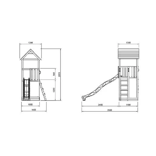Parque juegos infantil de madera Tibidabo con casita. El Parque infantil Tibidabo con casita, es una torre de madera cuadrada fuerte y muy bonita para su jardín. Su estructura alberga una casita en toda la mitad inferior. La casita, cuyo techo es a la vez el piso de 120 cm de altura por el que bajar por el tobogán, es ideal para que los más pequeños se refugien, jueguen y sueñen con mil aventuras. También podrán guardar en ella sus juguetes. La casita cuenta con una puerta de media altura que, junto con la ventana que hay en uno de los laterales, permite la entrada de mucha luz para que los niños puedan jugar durante horas. Las maderas de la casita dan, a su vez, mucha resistencia y estabilidad al conjunto del parque.
