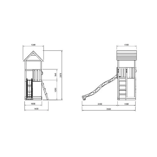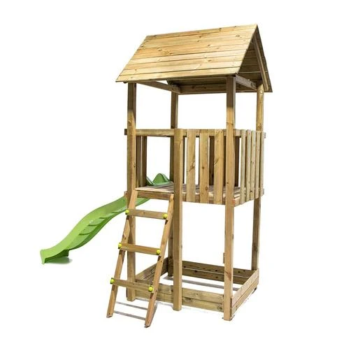 El parque infantil Tibidabo incluye todas las maderas para montar el parque y la escalera, la tornillería, la rampa de tobogán de color verde y los anclajes para fijarlos en un suelo blando de tierra o césped.