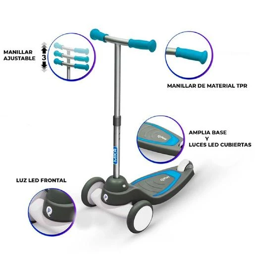 Patinete Mika azul con luces LED, un divertido patinete que permite a los más pequeños ejercitar su cuerpo y adquirir muchas habilidades importantes para su desarrollo.