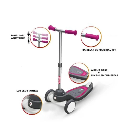 Patinete Mika rosa con luces LED, un divertido patinete que permite a los más pequeños ejercitar su cuerpo y adquirir muchas habilidades importantes para su desarrollo.