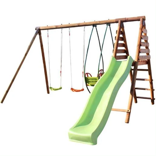 Se trata de un columpio de madera tratada con autoclave IV marrón. Es ideal para una casa con jardín, y para peques de 3 a 12 años.