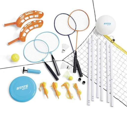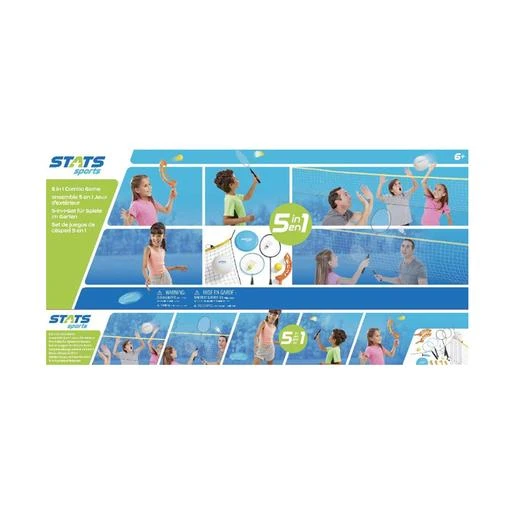 Stats – Juegos de Exterior 5 en 1 un set de juegos 5 en 1 que incluye bádminton, voleibol, lanzamiento, tenis y disco volador que sólo se puede encontrar en Toys R Us. Incluye una resistente bolsa de almacenamiento. Edad recomendada: +3 años.