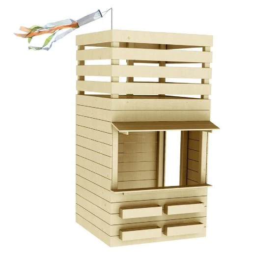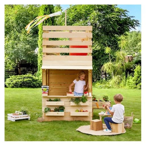¡Compacta y muy original con su mostrador de venta, la casita de madera Shopping permitirá a los niños convertirse en auténticos comerciantes y almacenar todos sus productos en las 4 papeleras incluidas! Pueden anotar la oferta del día en la pizarra. La gran abertura lateral asegura un fácil acceso al mostrador mientras que la escalera de madera conduce a los niños a la terraza para un merecido descanso.