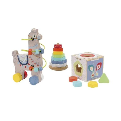 Wood’n’Play – Caja de madera con set de 3 juegos de madera. Este juego para bebés incluye una pirámide de colores, caja con formas y una llama sobre ruedas con su circuito de bolas.